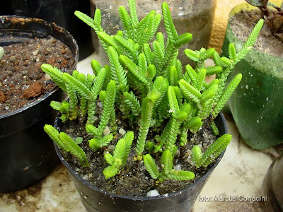 Da famíla Crassulaceae, Crassula muscosa é uma planta interessante e muito resistente. Praticamente não requer cuidado algum, desde que plantada em solo bem drenado e em sol pleno. As vezes precisa ser replantada simplesmente porque fica muito maior que o vaso e passa a invadir vasos vizinhos.