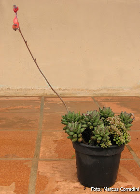 Não tenho certeza do nome dessa planta, mas acredito que seja Pachyphytum compactum. Pertencente à família Crassulaceae, não requer muitos cuidados. Gosta de sol pleno e solo bem drenado. A minha fica direto na chuva, sol, vento e vai muito bem. Esse ano, floriu pela segunda vez. Lindas flores. Veja:.jpg)