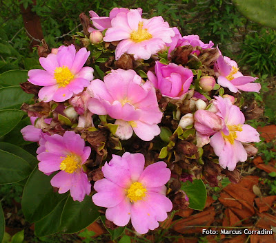 Pereskia grandiflora, apesar das folhas, é uma Cactácea. De crescimento vigoroso, é ideal para jardins, onde vai bem em qualquer tipo de solo.A floração é muito bonita e acontece praticamente o ano todo em condições adequadas. Veja o detalhe da flor: