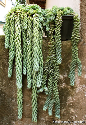 Sedum morganianum é uma planta comumente encontrada em cultivo e é, pelo que me lembro, uma das primeiras suculentas que vi na vida. Seu nome popular é Rabo-de-burro e é originária do México.
