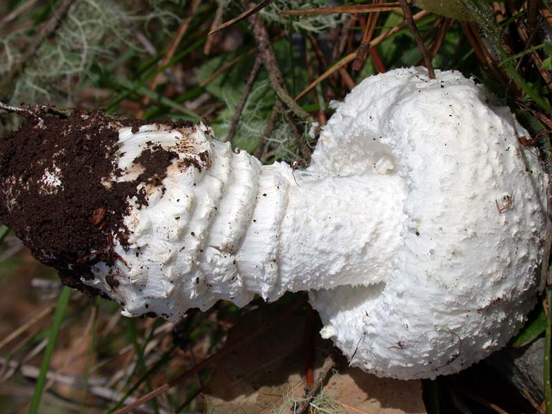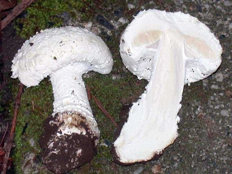 - StipeEstipe 70-170 x 20-40 mm de largura, redondo, sólido, igual a gradualmente aumentado ou sub-bulboso na base com uma extensão pontiaguda em forma de raiz; superfície seca, branca, fibrilose obscuramente no ápice, em outros lugares esparsamente coberto com fragmentos de véu universal de algodão, às vezes descolorindo o marrom; anel ausente ou, se presente, efêmero; volva pouco desenvolvida, consistindo em faixas concêntricas de fragmentos de véu descolorindo o marrom pálido a marrom rosado.